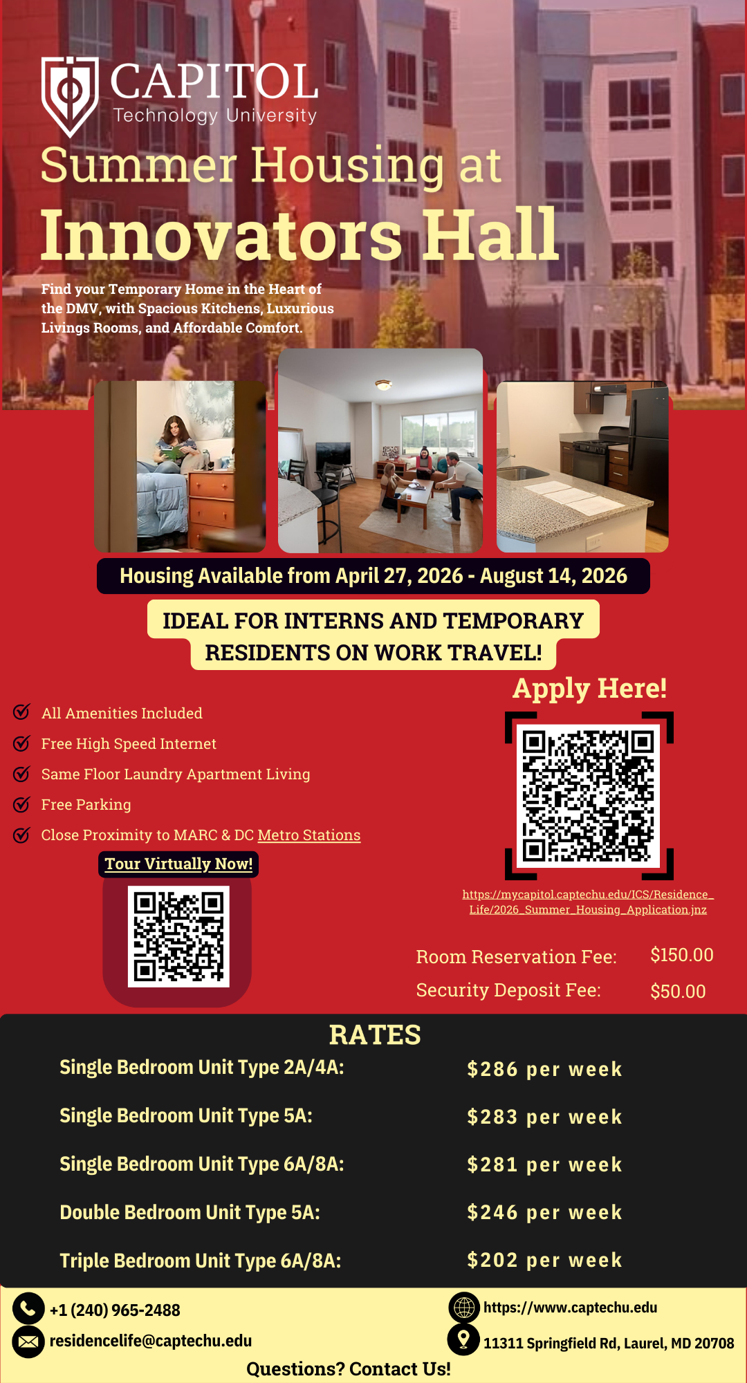 Housing at Capitol Technology University is an excellent way to be conveniently close to classes and professors, as well as living and learning with other students just like YOU!